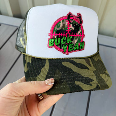 Buck Yeah Hunting Camo Glitter Embroidered Patch Trucker Hat
